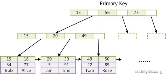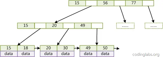如图4所示,在B+Tree的每个叶子节点增加一个指向相邻叶子节点的指针,就形成了带有顺序访问指针的B+Tree。做这个优化的目的是为了提高区间访问的性能,例如图4中如果要查询key为从18到49的所有数据记录,当找到18后,只需顺着节点和指针顺序遍历就可以一次性访问到所有数据节点,极大提到了区间查询效率。