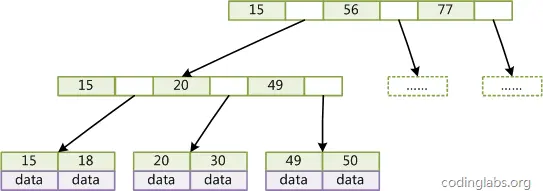 图1展示了一种可能的索引方式。左边是数据表,一共有两列七条记录,最左边的是数据记录的物理地址(注意逻辑上相邻的记录在磁盘上也并不是一定物理相邻的)。为了加快Col2的查找,可以维护一个右边所示的二叉查找树,每个节点分别包含索引键值和一个指向对应数据记录物理地址的指针,这样就可以运用二叉查找在\(O(log_2n)\)的复杂度内获取到相应数据。
