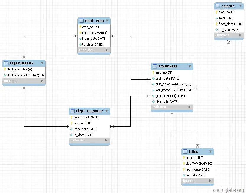 为了讨论索引策略,需要一个数据量不算小的数据库作为示例。本文选用MySQL官方文档中提供的示例数据库之一:employees。这个数据库关系复杂度适中,且数据量较大。下图是这个数据库的E-R关系图(引用自MySQL官方手册):