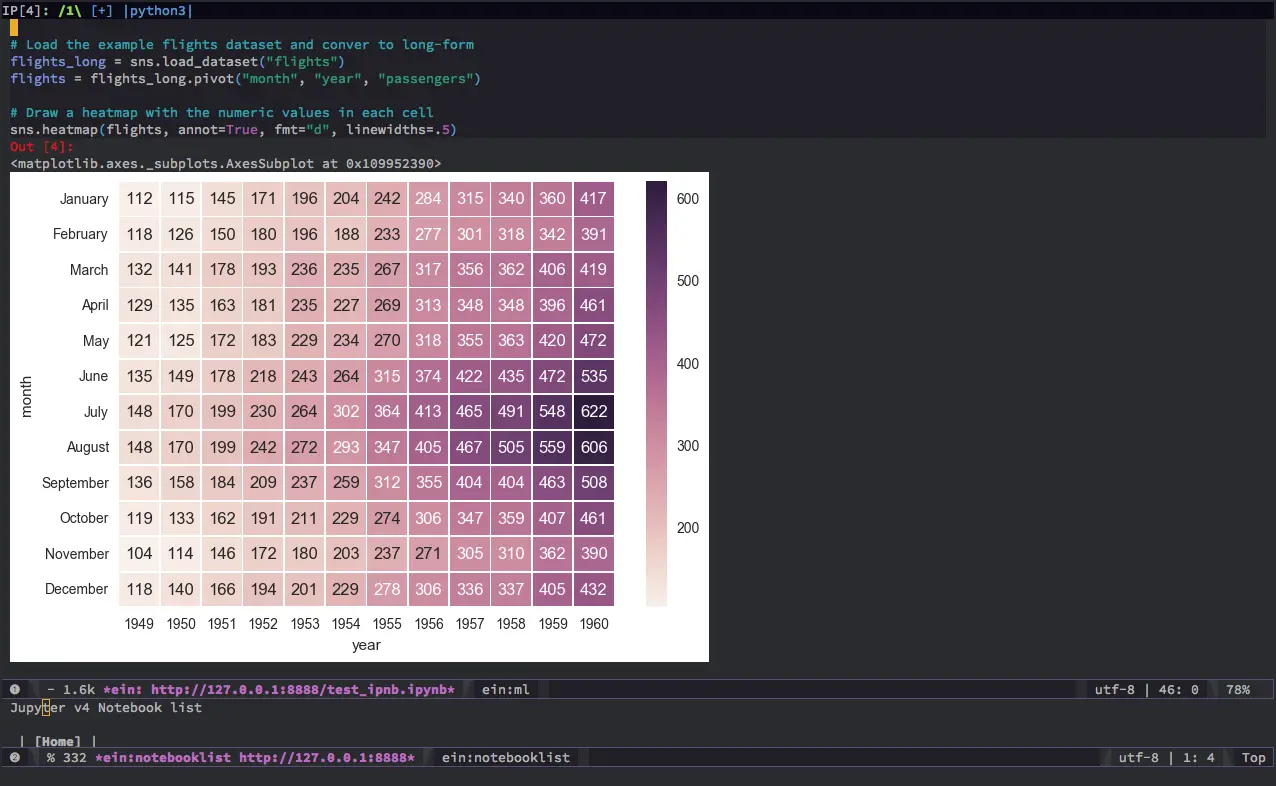 接着打开 emacs, 输入 spc-a-i-n, 默认端口,然后输入密码即可。首次登陆后还需要在输入一次 spc-a-i-n 即可看到 IPython Notebook 的主界面。
