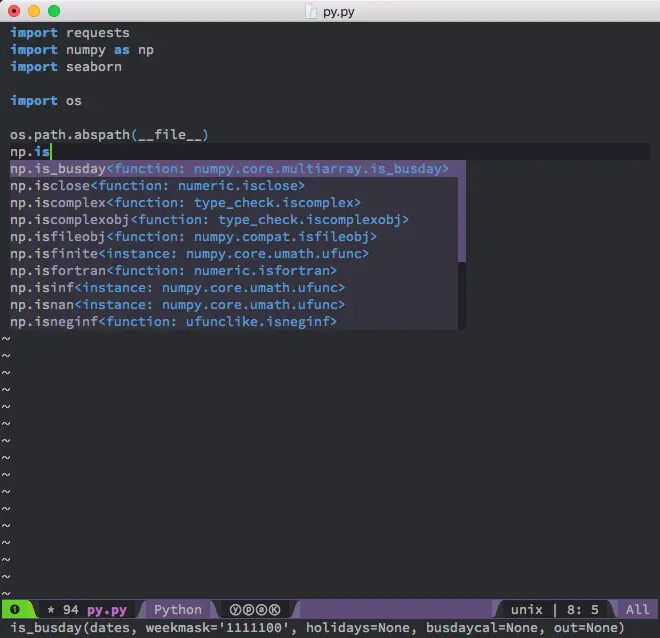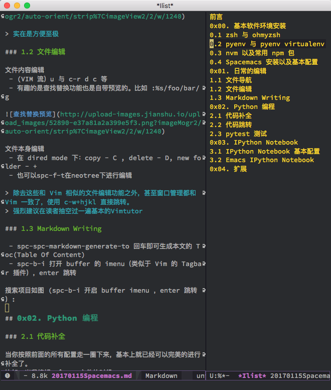 注:本文所有内容基于 macOS 10.11, 软件环境为 zsh , pyenv , python3.5.2 , node5.12.0. 其他类 Unix 平台略作修改即可使用。至于 Windows 平台,建议安装 Ubuntu 虚拟机。本文也需要读者具备基本的 VIM 基本常识和 Python 常识。