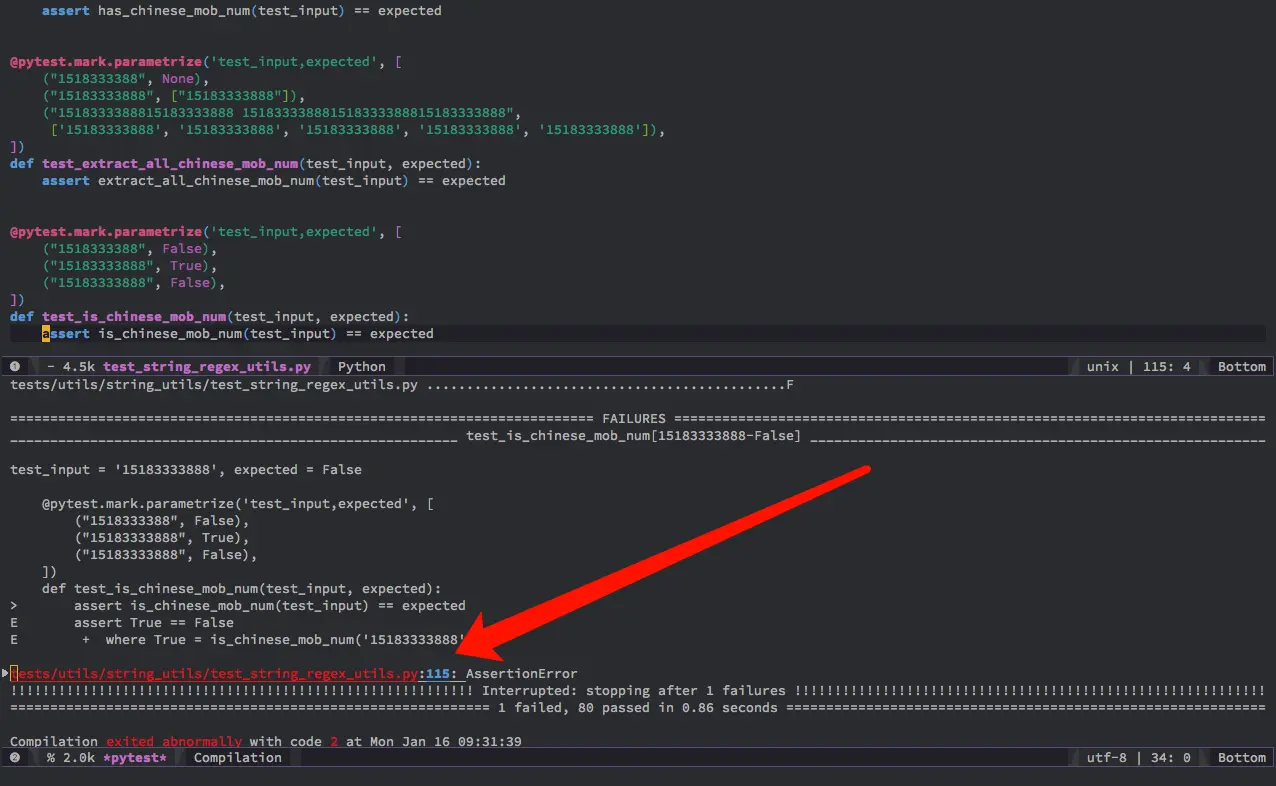 运行测试失败,运行测试失败,使用 c-w-j 跳转到下面窗口,对红色标记处 enter, 即可跳转到出错文件行。