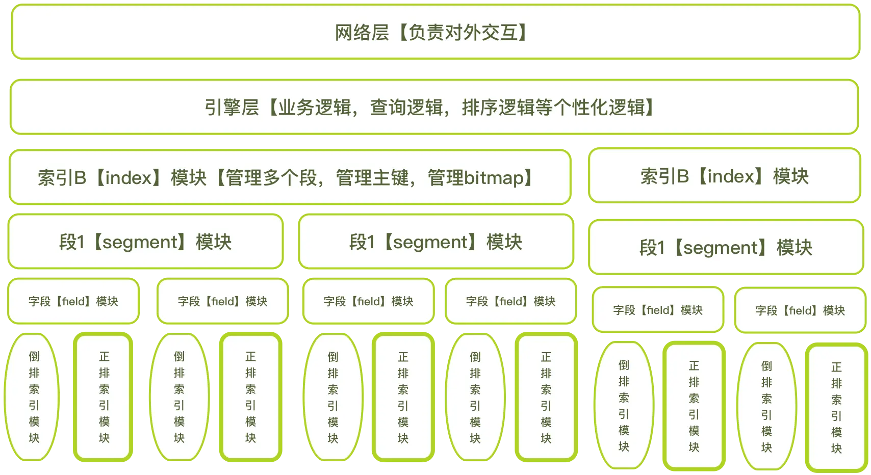 - 索引模块层之上是引擎层,这一层实现具体的业务查找逻辑。