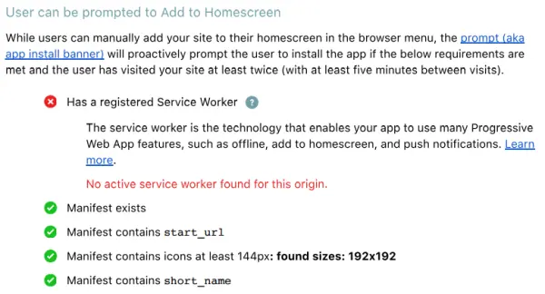 manifest 其实我已经加上了,还是因为 service worker 没有注册,所以最后没有生效。