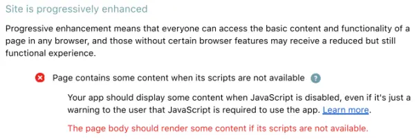 即 JavaScript 被禁用的时候,页面仍然应该有内容,即便那只是提示用户需要打开 JavaScript 以使用 app。