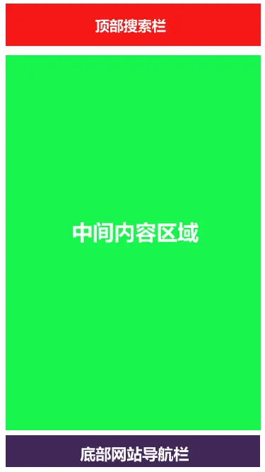 我们分析一下页面结构,设计图顶部出现的是一个固定在顶部的搜索栏,中间是我们理解为产品内容区域,而底部是一个固定的网站导航栏,那么从现在开始,你的脑海应该呈现这样的一副按“块”分的设计图结构,然后分块完成之!如下图: