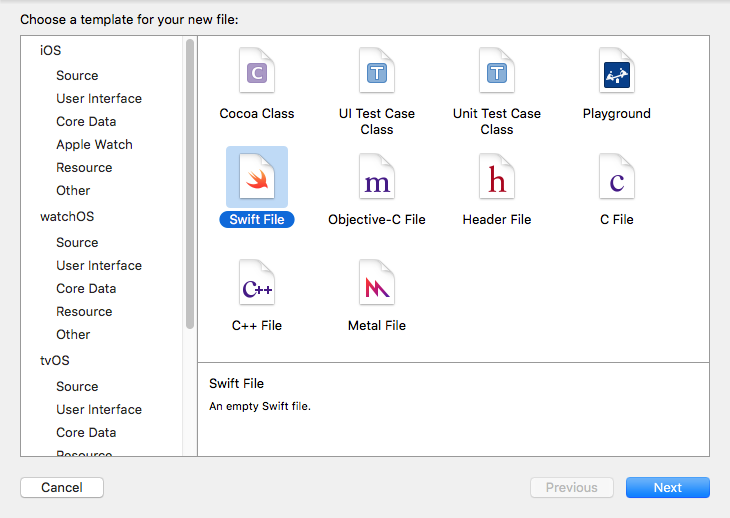 选择 iOS->Source->Swift File 添加新的文件作为 xml 文件中不同项的数据模型。我们叫它 Book.swift,并替换成以下代码