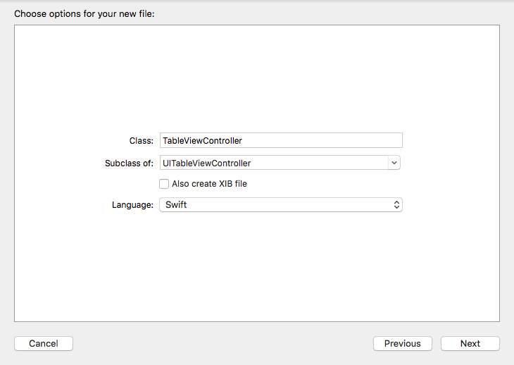 既然我们删除了初始 View Controller ,ViewController.swift 也可以一起删除了。选择 iOS->Source->Cocoa Touch Class 添加一个新的文件,命名为 TableViewController,并且设置它为 UITableViewController 的子类。