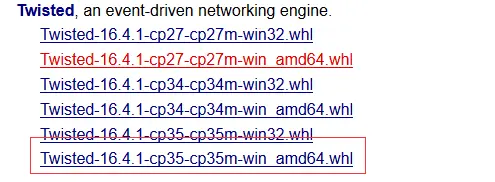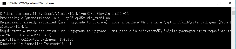 pip install E:\demo\Twisted-16.4.1-cp35-cp35m-win_amd64.whl(下载好的twisted模块的whl文件路径)