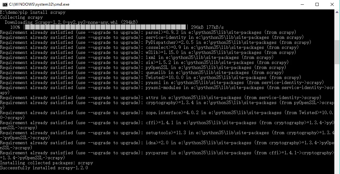 twisted库安装成功后,安装scrapy就简单了,在命令提示符窗口直接输入命令: pip install scrapy 回车
