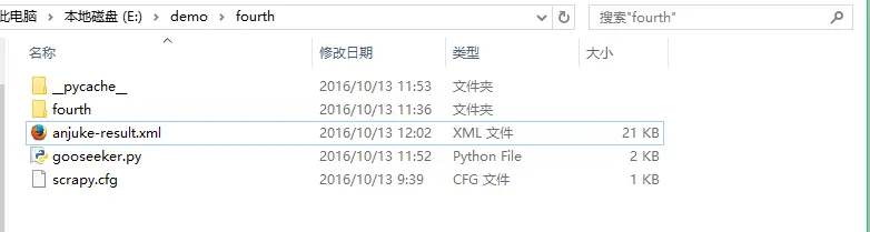 查看保存结果文件,进入Scrapy爬虫项目目录,这里为E:\demo\fourth,找到名称为anjuke-result.xml的文件夹然后打开
