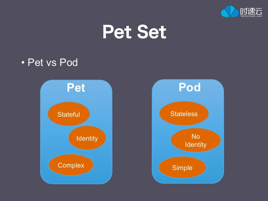 什么是Pet Set?顾名思义是Pet的集合,那什么是Pet呢?它是一种需要特殊照顾的Pod。它有状态、有身份、当然也比普通的Pod要复杂一些。