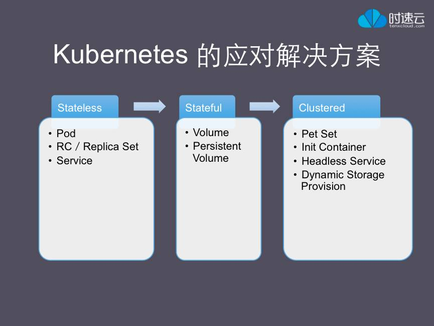 最后是有状态集群服务,它又多了集群管理的需求。Kubernetes为此开发了一套以Pet Set为核心的全新特性,方便了有状态集群服务在Kubernetes上的部署和管理。