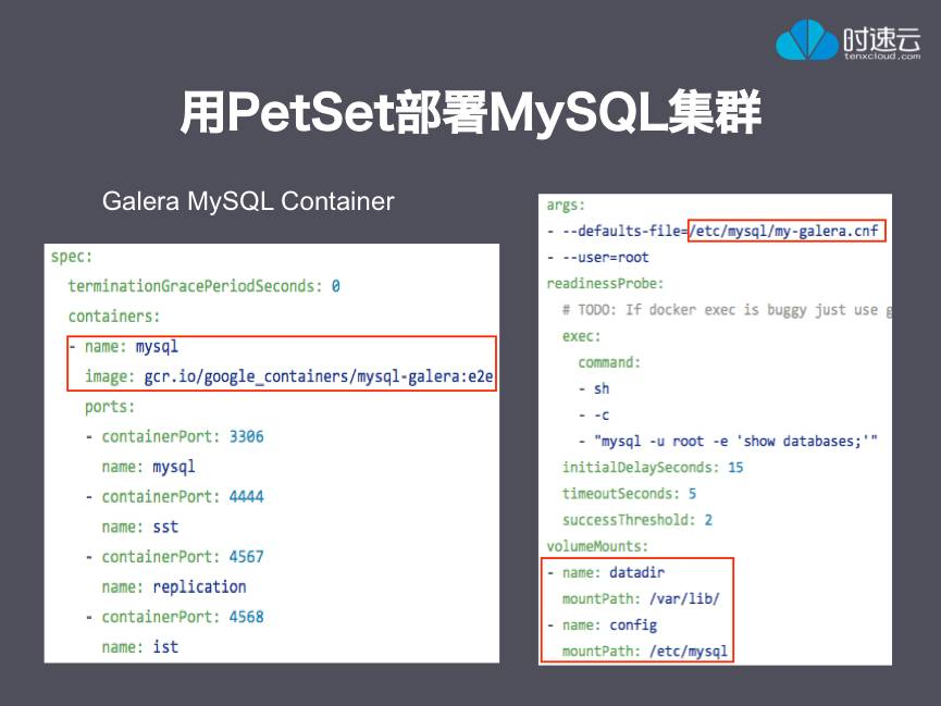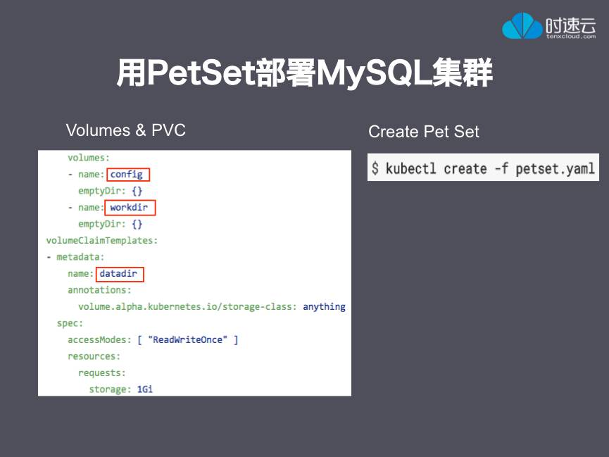 所以部署一个集群总共就需要两个YAML文件就可以了,一个Headless Service,一个 Pet Set。其中Pet Set里定义了初始化容器和存储卷。