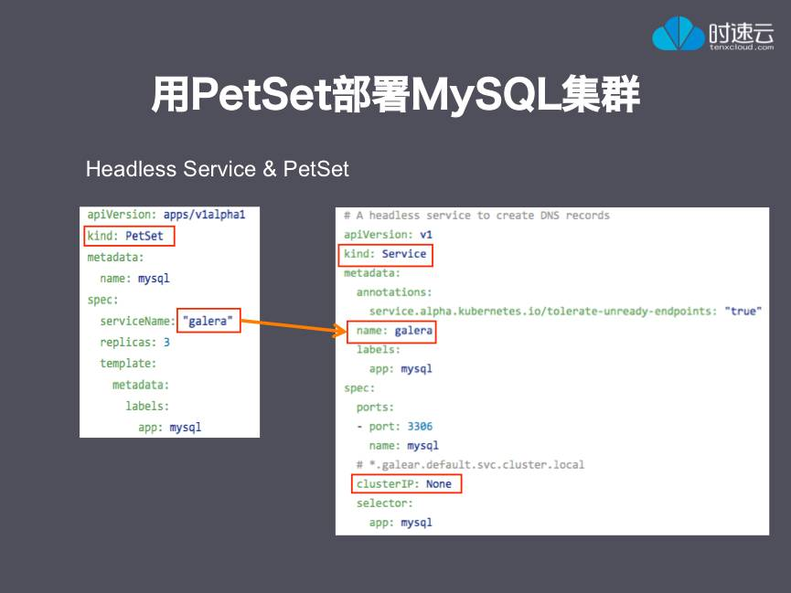 第一点是在最新发布的 Kubernetes 1.5 里 PetSet 重新命名为StatefulSet。所以根据你使用的Kubernetes版本不同,可能看到的名字也不一样。
