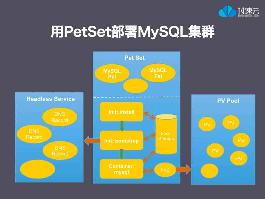 左边的Headless Service用于为每个MySQL Pet实例提供一个DNS名字,右边的PV池为MySQL提供存储 。
