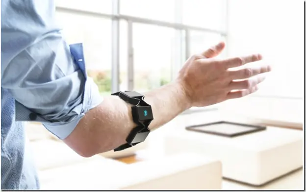 炫酷手势臂环 Myo Armband 允许用户戴在胳膊前臂上,可以通过动作命令来控制电脑,通过对动作和脑电活动的检测,Myo Armband可以识别出用户的手势活动。