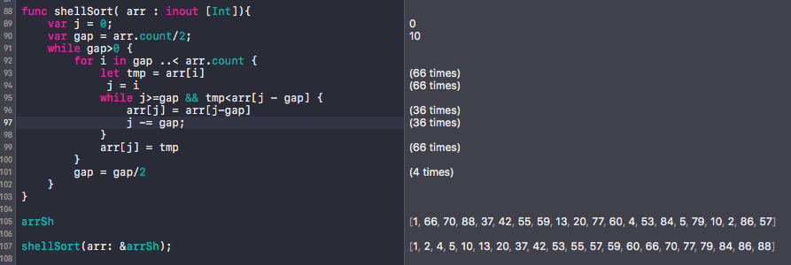 - 缩小步调。重复以上步骤。知道步调为1,完成排序。