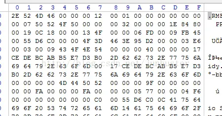 上图是用winhex软件打开rmvb格式的电影美人鱼后的部分截图,从图中可以看出它本质上其实就是一系列的二进制01串(图中是以16进制表示的)。例如图中第一个‘数字’ 2E其实就是二进制的0010 1110,也就是8个二进制的bit,所以我们何不以每8个bit为一个单位把它看做课本中的例子中的‘字符’呢?根据排列组合,8个bit最多有256中情况:从0x00到0xFF。当然这256种编码所代表的‘字符’只有部分是可以以ASCII码的形式打印出来的。那么我们在代码里把要处理的文件以‘二进制’格式读入内存,把内存里的bits们看做一个个的char,然后统计256种char每一个出现的频率。这样我们就可以根据每一个‘字符’出现的频率来构造一颗huffman树了,进而得到每一个‘字符’的编码,并把编码写入到另外一个文件里面,便得到了压缩后的文件。然后我们按照同样的规则对压缩后的文件按照huffman树来解码,把解码出来的‘字符’在写入到新的文件里面,于是就得到了新的解压缩后的文件了。