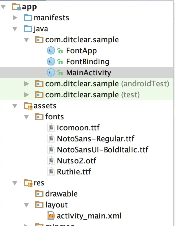 在项目中的assets/fonts文件夹下加入了5种字体,然后在strings.xml中定义了字体的路径