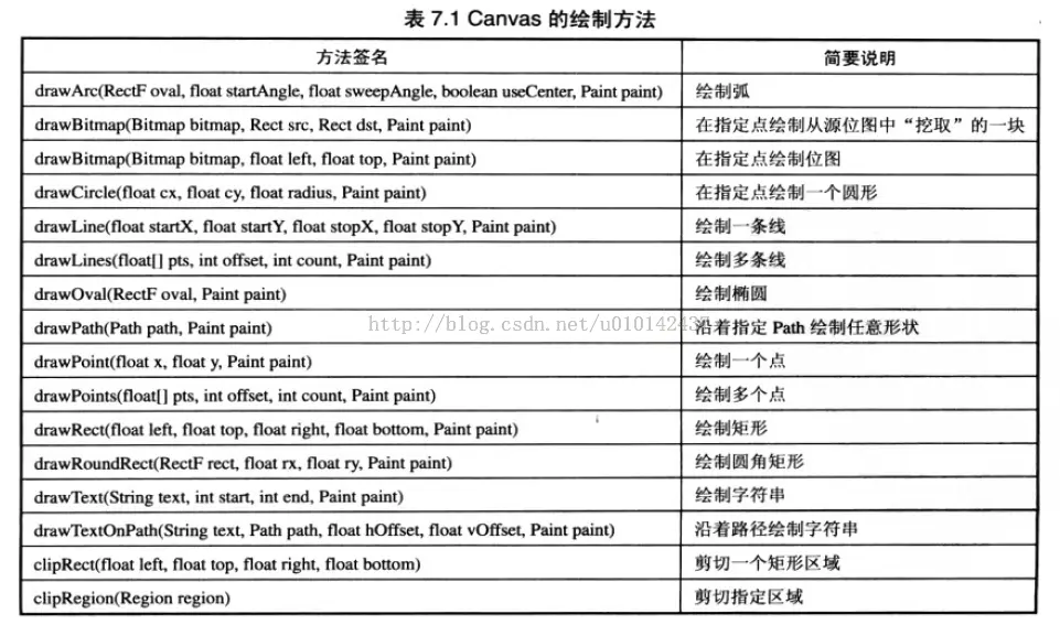 在Android中的绘图应该继承View组件,并重写它的onDraw(Canvas canvas)方法,Canvas代表了“依附”于指定View的画布,它提供了如下方法绘制各种图形(Canvas提供了一个drawTextOnPath(String text,Path path,float hOffset,float vOffset,Paint paint)方法,该方法可以沿着Path路径绘制文本,其中text指文本内容,hOffset参数指定水平偏移、vOffset指定垂直偏移):