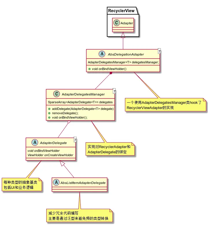 AdapterDelegates的思路是使用自定义的Adapter来“hook”原来的RecyclerView的Adapter,主要的Adapter方法如onBindViewHolder和onCreateViewHolder方法都被劫持使用adpter内部的一个Manager类来实现,参看下面的类图会更加容易理解。