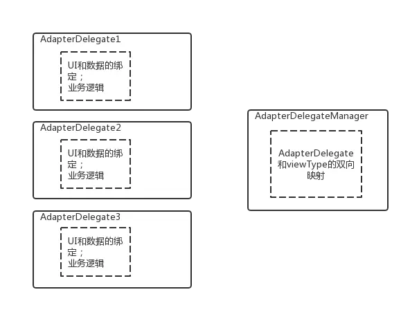 但是通过这一层的封装,成功的把多类型的情况分隔开,每种类型只需要在各种的AdapterDelegate中去编写业务逻辑就可以,Adapter中的职业就非常简单,只需要持有AdapterDelegateManager,由这个Manager类来维护每种类型具体对应的AdapterDelegate,而由AdapterDelegate维护UI和数据的绑定关系。