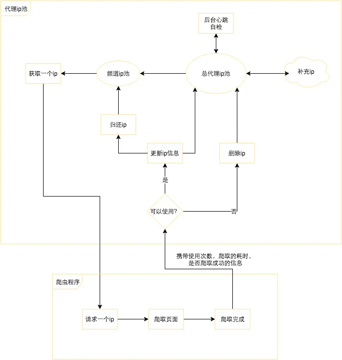 由上图所示,左侧是形成了整个流程的闭环,从爬虫程序以独占的方式拿到一个代理 ip 到爬取完成归还 ip。这个流程其实是不太严谨的,如果爬虫程序异常中断,就会导致 ip 无法归还,就会导致这个 ip 无法循环利用。但是由于代理 ip 本身的特点,量多而且循环利用的价值并不大,所以这种情况就let it go。