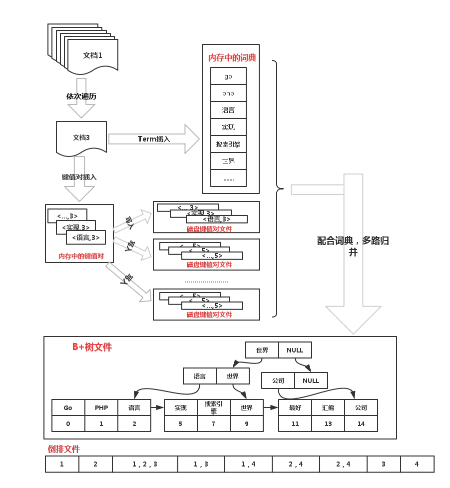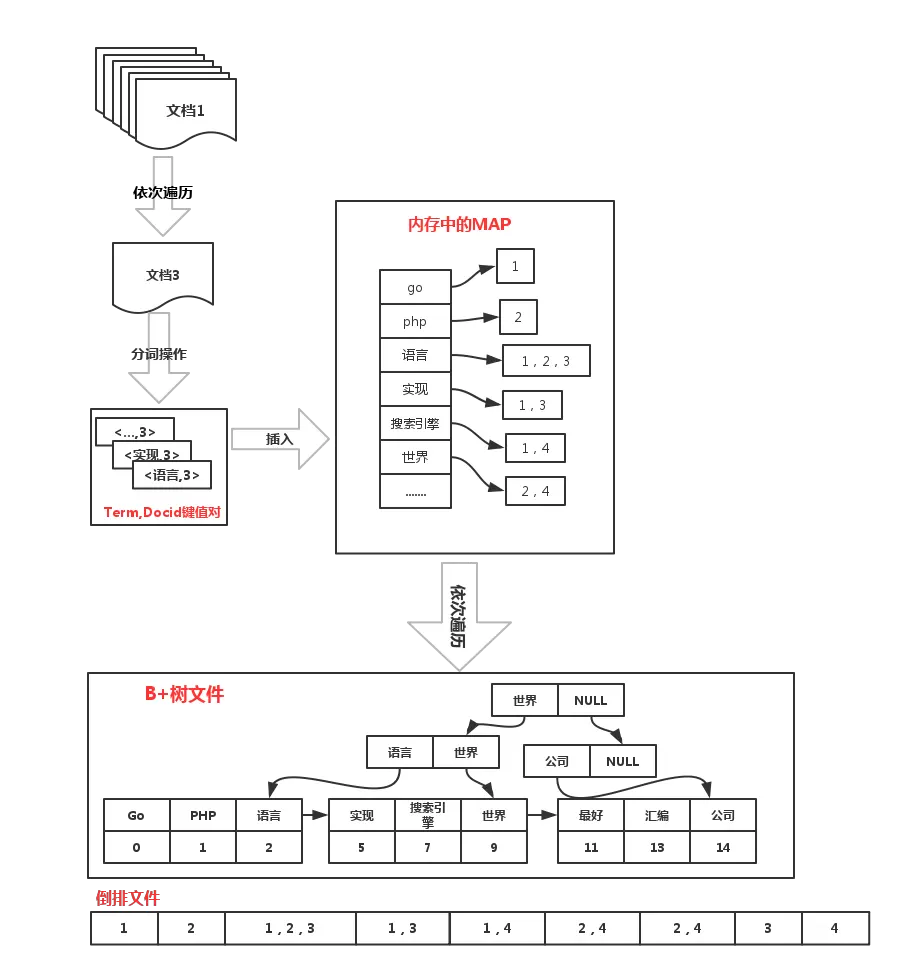 - 遍历map中的,将value写入倒排文件中,并记录此value在文件中的偏移offset,然后将写入B+树中