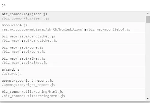 我很诧异,为什么已经开启了Disable cache,js只加载了一个,而且体积这么小。接着,我按住Ctrl+O进行资源文件查找,发现我被“忽悠”了。其实根本就不止一个js文件。