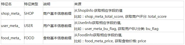 基础特征为线上可以通过配置特征名直接从SHOP/USER获取特征值的特征, 比如:shop_meta_、user_meta_、food_meta_等, 详细说明如下表,其从本质上来讲等同于特征操作符(复合特征)。