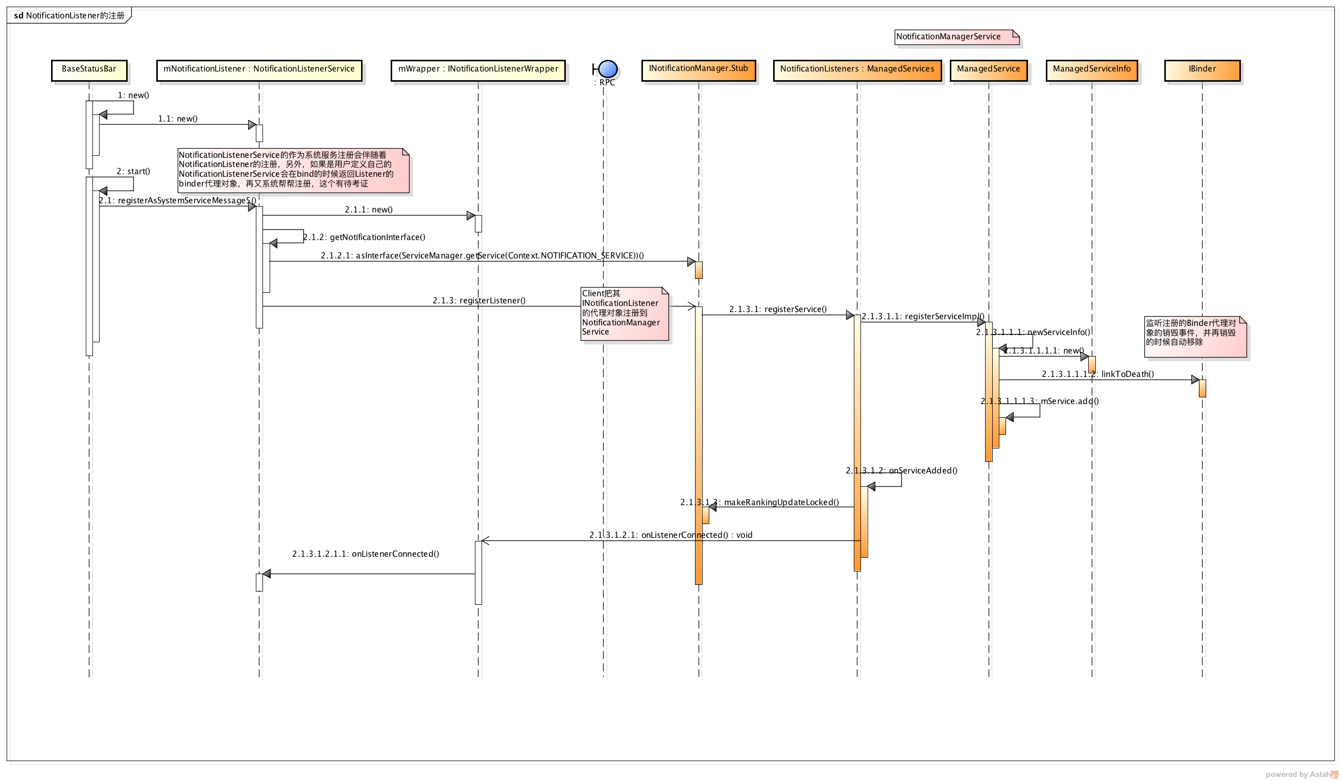 NotificationListener是SDK18+以上才有的,因为SDK18开始提供了NotificationListenerService可以用来读取应用通知,其实现就是通过NotificationListener来实现的,其内部有一个INotificationListener.Stub类型的Binder本地对象,把其Binder代理对象注册到NotificationManager,监听通知的变更,而系统通知栏改也为了用NotificationListenerService来实现,通知栏启动的时候启动其内部的NotificationListenerService并注册,注册的Binder代理对象会以ManagerServiceInfo的形式记录在NotificationManagerService的NotificationListener列表,并且会在NotificationListener的Binder对象销毁的时候自动从列表中移除