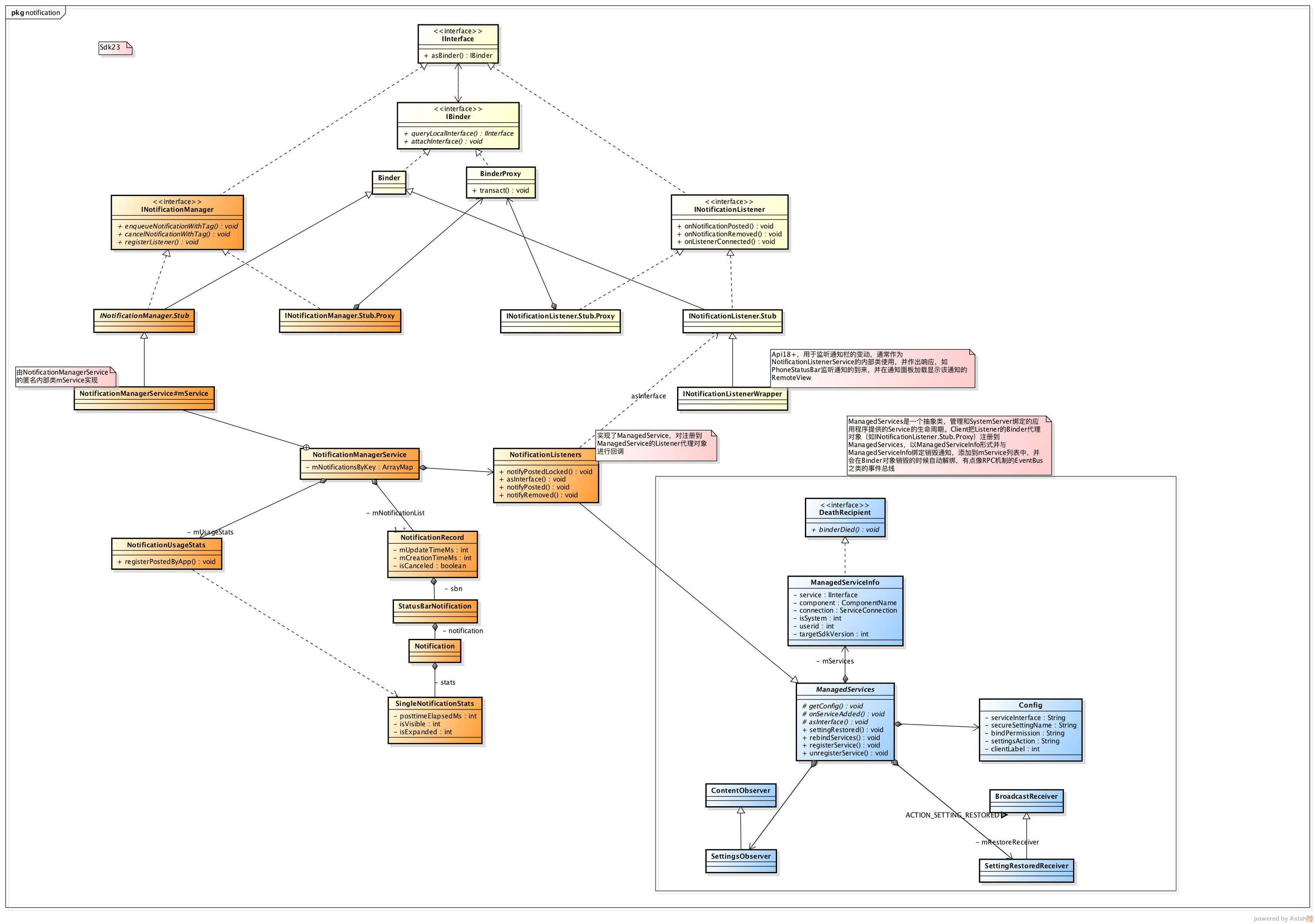 Notification的机制简单的分位两大角色,NotificationManager和NotificationListener,前一个用来发布、更新、管理通知,后一个用于监听通知的变化,典型的观察者模式