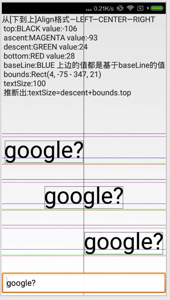 - 一个字的高度 并不是textSize 而是top与bottom差值(代表绘制一个TextSize大小的字所需要的空间);