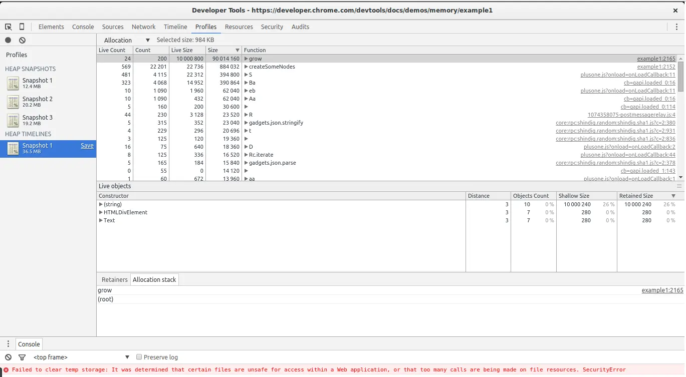 这个视图给了一个与它们相关的函数和内存分配的列表。我们可以立即看到grow和createSomeNodes。当选择grow时,看看相关的object constructor。 可以注意到(string),HTMLDivElement和Text泄露了。
