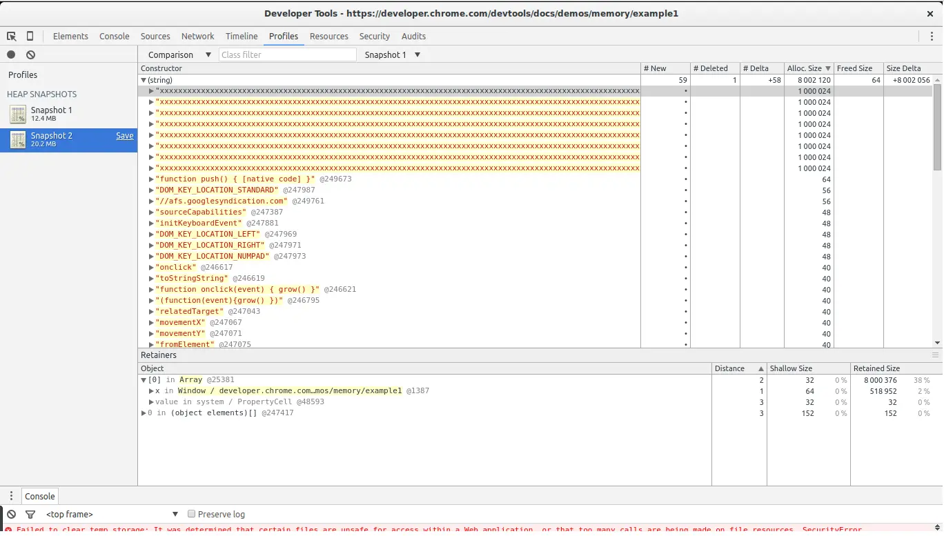 我们看到我们选择的分配是数组的一部分。反过来,数组由全局窗口对象内的变量x引用。这给了我们从我们的大对象到其不可收回的根(窗口)的完整路径 我们发现我们的潜在泄漏和被引用的地方。