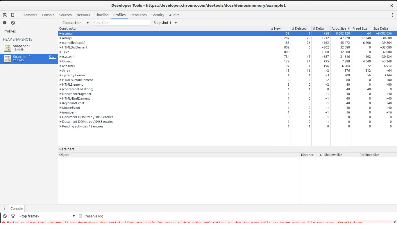 重新加载页面,并在完成加载后立即获取堆快照。 我们将使用此快照作为我们的基线。之后,再次点击最左边的Profiles按钮,等待几秒钟,并采取第二个快照。捕获快照后,建议在脚本中设置断点,以防止泄漏使用更多内存。