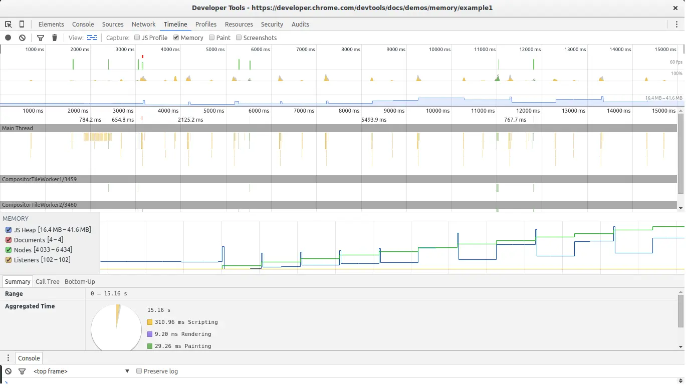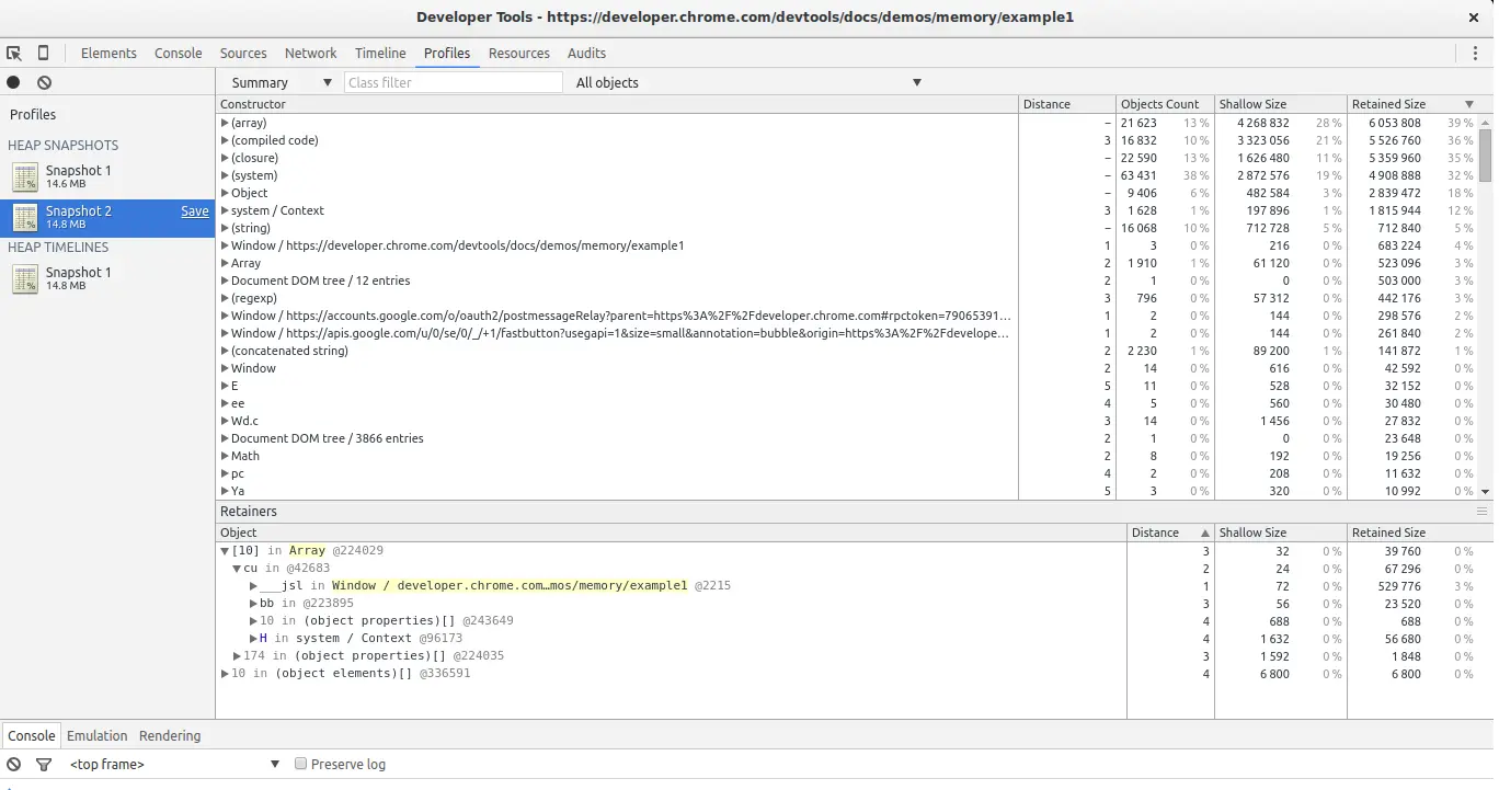 Chrome提供了一组很好的工具来分析JavaScript代码的内存使用情况。 有两个与内存相关的基本视图:时间轴视图和配置文件视图。