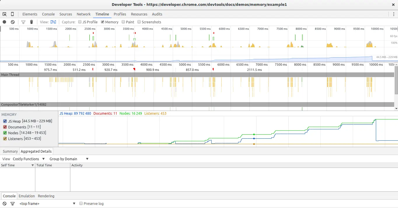Timeline非常有用。 在Chrome中打开示例,打开开发工具,转到Timeline,选择Memory,然后点击录制按钮。 然后转到页面并单击按钮开始泄漏内存。 一段时间后停止录制,看看结果: