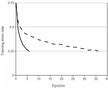 实线、间断线分别代表的是ReLU、tanh的training error,可见ReLU比tanh能够更快的收敛