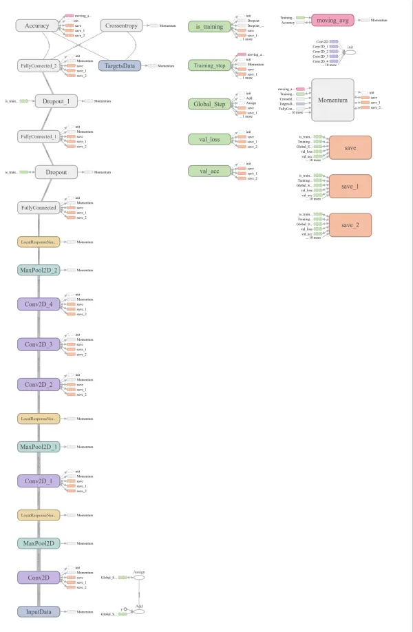 使用tflearn版本的alexnet来做实验,从TensorBoard上得到的基本效果如下, alexnet graph 如下: