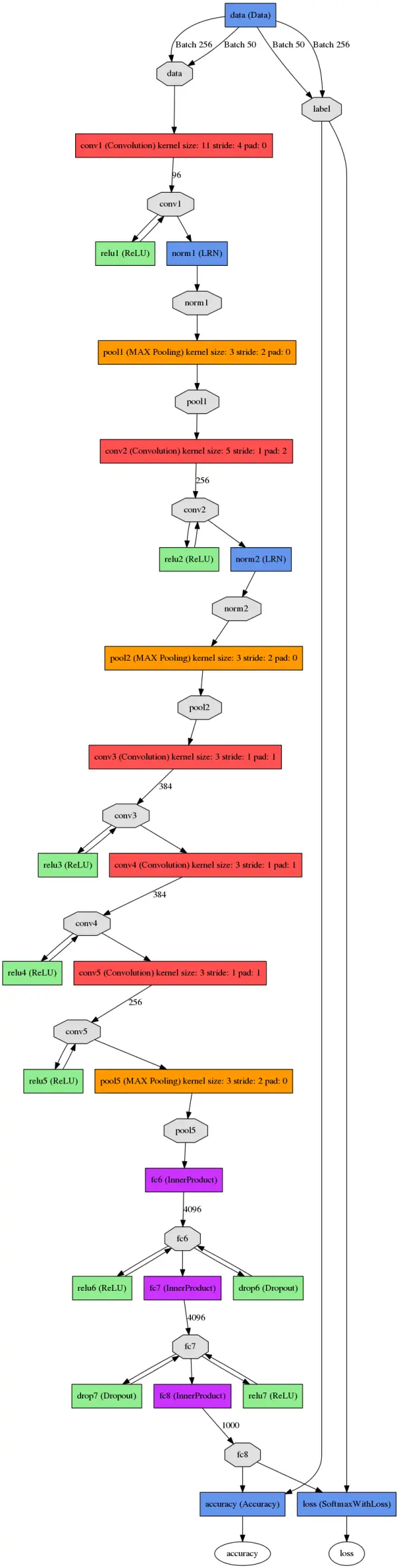 这张图是基本的caffe中alexnet的网络结构,这里比较抽象,我用caffe的draw_net把alexnet的网络结构画出来了
