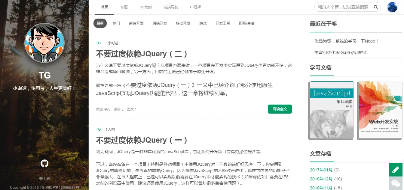 2016年,游历在掘金、前端网、segmentfault、伯乐在线、CSDN、博客园、众成翻译等技术网站上,收获颇丰。