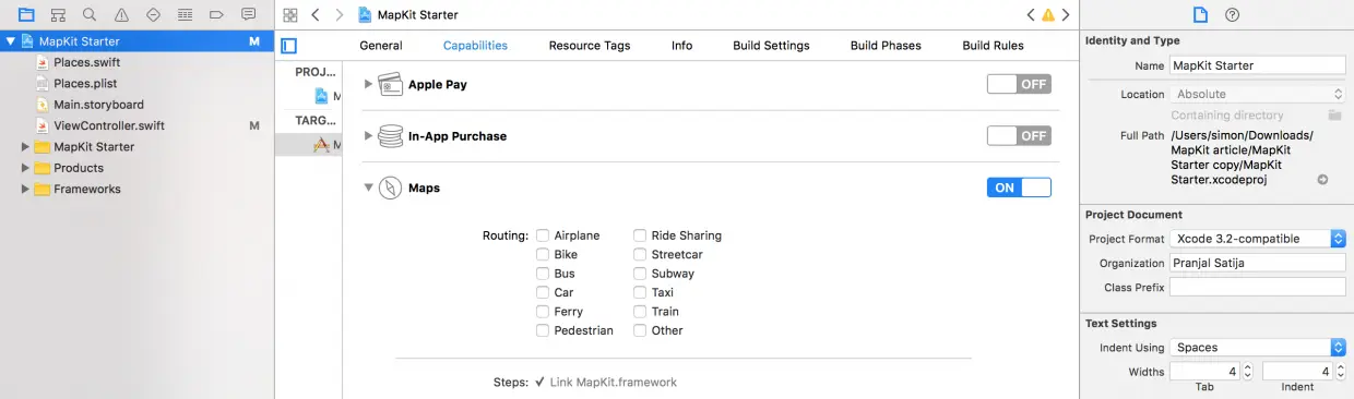 在构建运行应用之前,还有一件事情需要做:导入 MapKit.framework 到我们项目中,这样才能使用 MapKit。有两种方式:一种是手动添加依赖库。点击项目导航中的 MapKit starter ,向下滚动到 Linked Frameworks and Libraries :