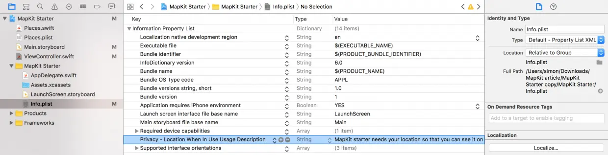 最后一件事。找到 Info.plist 文件。增加一个类型为 String 的键 NSLocationWhenInUseUsageDescription,然后设置值为 MapKit starter needs your location so that you can see it on a map.。通过这个可以告诉用户我们为什么要去请求使用位置信息,从而让用户更倾向于同意访问。从 iOS 8