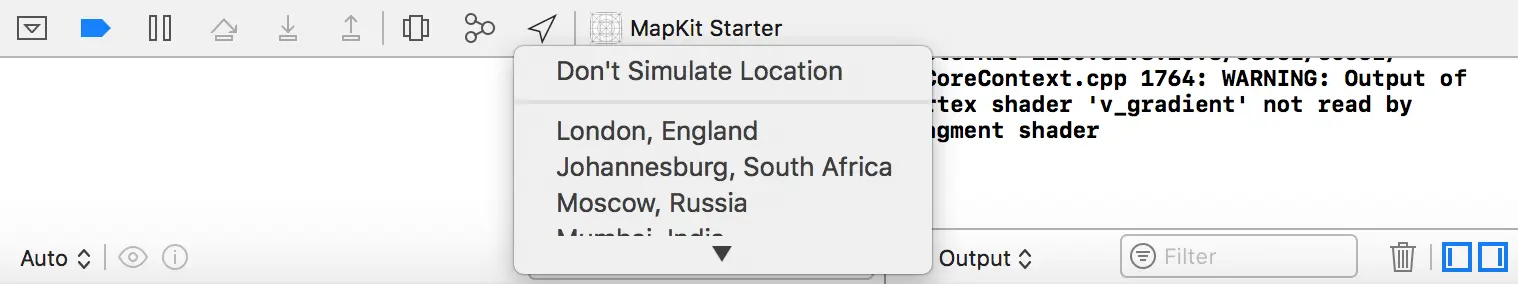如果你在用模拟器测试应用,你可以点击调试区域的位置按钮,Xcode 提供了一系列位置信息来模拟用户的位置。