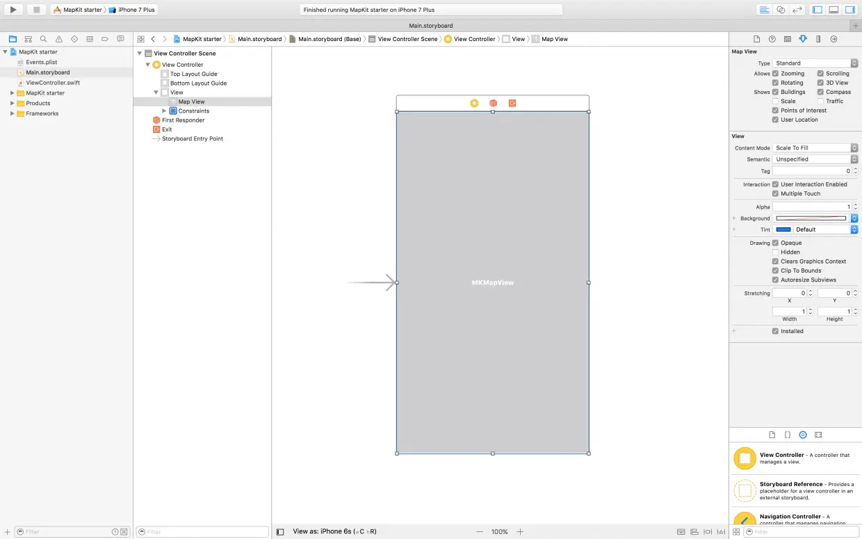 Places.plist:这是存储我们要渲染的坐标信息的配置文件。Places.swift:这个 swift 文件加载Places.plist文件中的数据并暴露给其他代码。Main.storyboard:这是我们应用使用的主 storyboard 。里面是一个带有地图视图的视图控制器。我已经搭建好界面和约束了。ViewController.swift:这是用于控制地图的试图控制器。我已经创建好一个连线来连接 storyboard 中的地图视图。