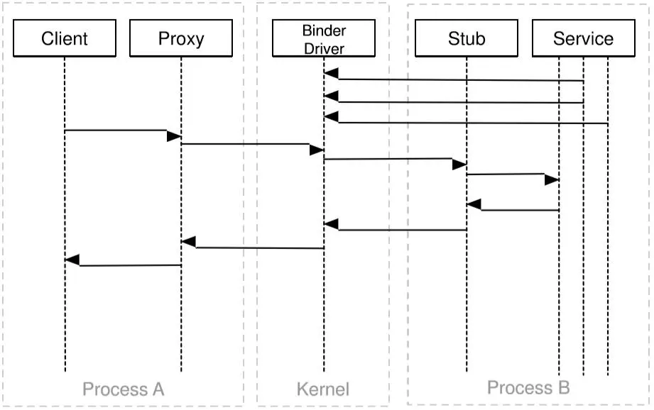 根据由客户端 - 服务器同步模型组织的进程之间的通信。客户端发起连接并等待来自服务端的回复。 因此,客户端和服务器之间的通信可以被想象为在相同的进程线程中执行。 这为开发人员提供了调用远程对象上的方法的可能性,就像它们是本地的一样。 通过 Binder 的通信模型如图 4.1 所示。 在这个图中,客户端进程 A 中的应用程序想要使用进程 B [12]中运行的服务的公开行为。
