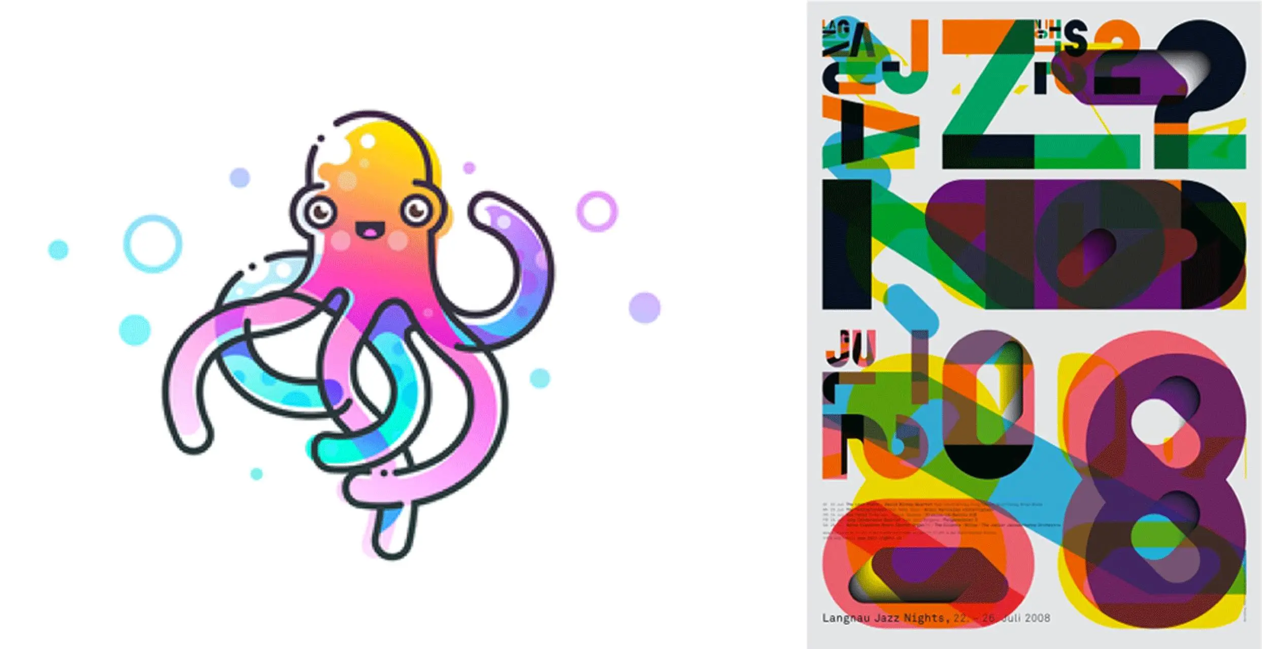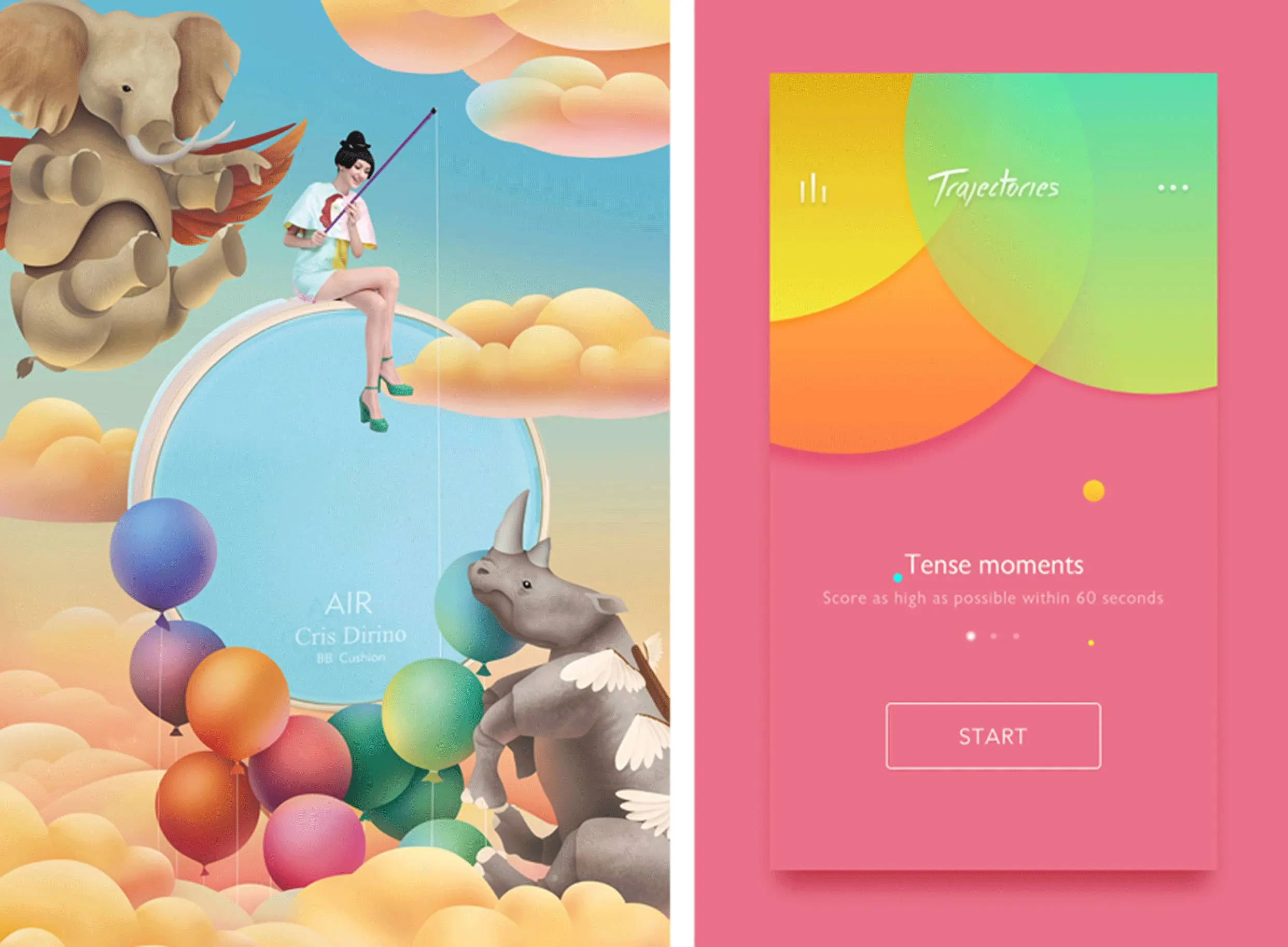渐变的运用,在视觉设计中增加了更多细节化元素,并使画面充满变化。从2016年开始,渐变逐渐突破同色系,向多色系发展,打破保守的两色渐变规则。同时,跨越色轮的多种同级饱和度颜色结合有机圆润的形状,呈现出润泽透光的质感,体现出温婉的气质,柔和丰富而不艳俗。