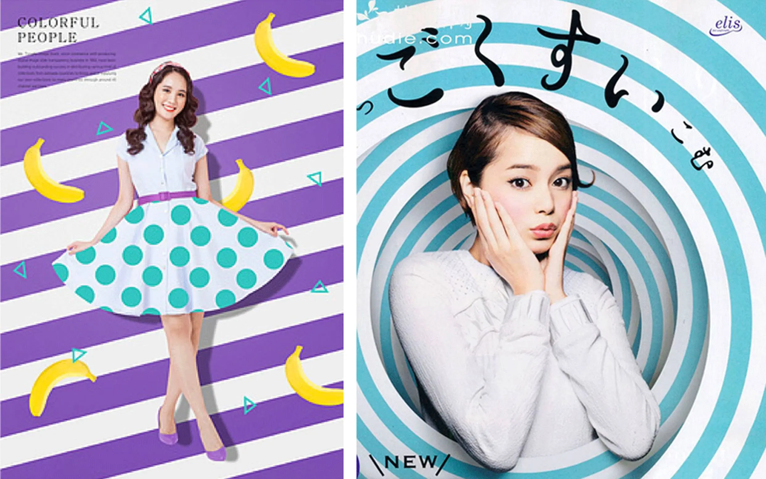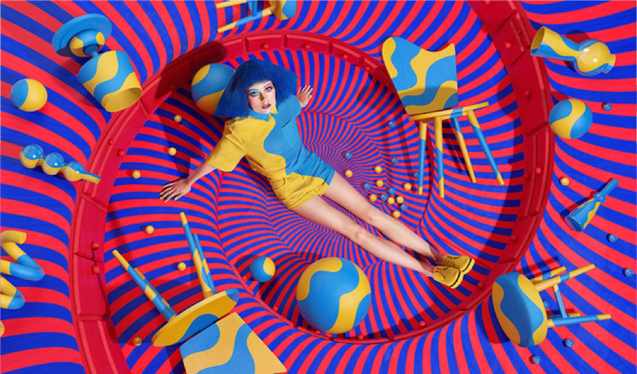 欧普艺术起源于1960年代法国,这是一种精心计算的视觉艺术,使用明亮对比的色彩,造成刺眼的颤动效果。将欧普艺术的元素弱化,混搭多种元素,打破传统的图形限制,利用视觉变化造成幻境效果,营造活泼跳跃的画面氛围。